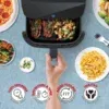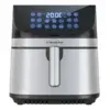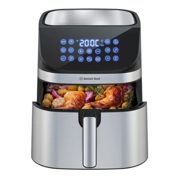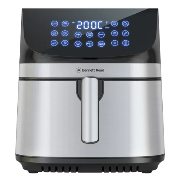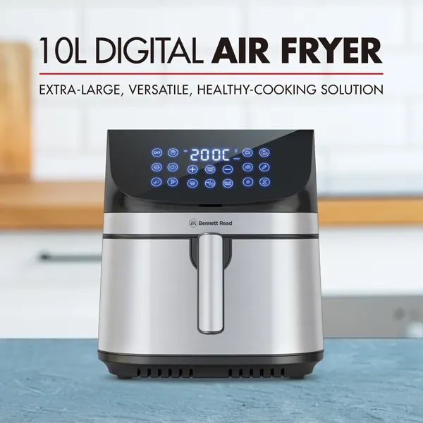 The Bennett Read 10L Digital Air Fryer is an 1800W appliance with an extra-large non-stick drawer, featuring a digital LED display and preset cooking functions for home-cooked meals.