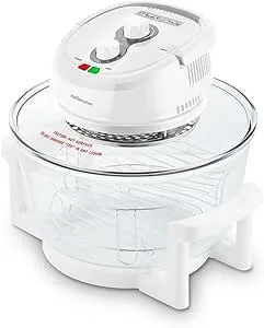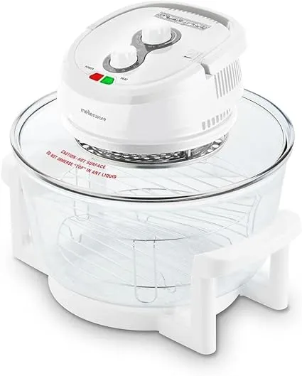 Mellerware Turbo Cook Air Fryer has a powerful heating element with an incoporated fan inside the glass lid which combined with its large 12L glass body, allows you to cook faster and more evenly than most convectional ovens and deep fryers.