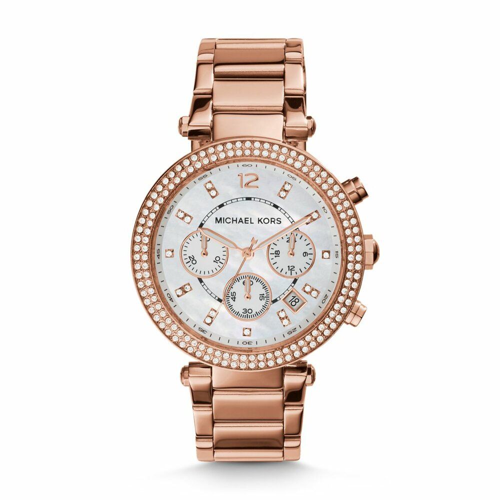 Michael Kors interprets the rose gold trend with this crystal-embellished timepiece.