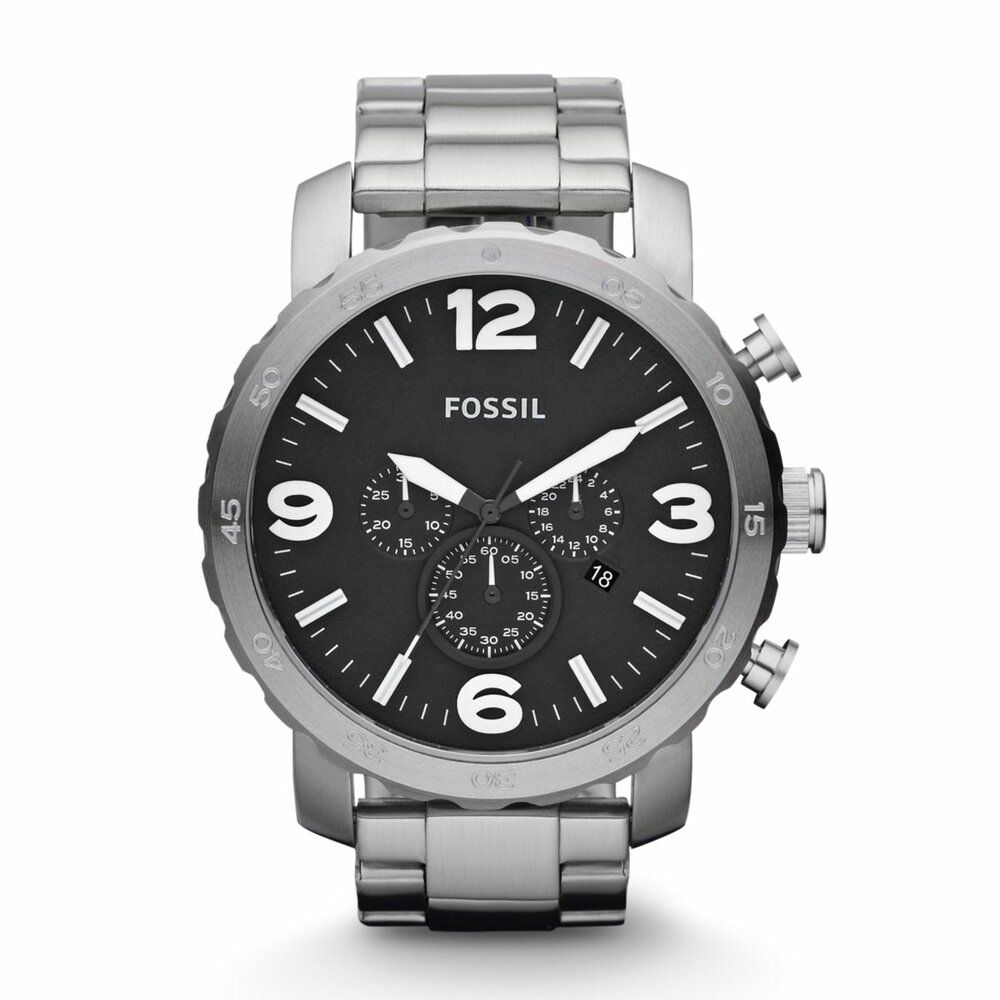 Add some military-inspired style to your wrist with our stainless steel Nate watch. A classic black dial and white indexes add instant polish to any look. This Nate watch also features a chronograph movement on a stainless steel bracelet.