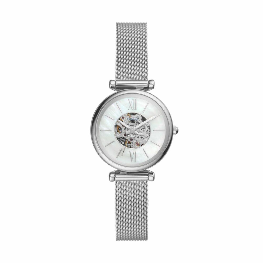 This 28mm Carlie Mini features a white mother-of-pearl dial, automatic movement and a silver-tone stainless steel mesh bracelet.
