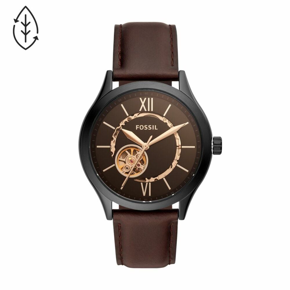 This 44mm Fenmore watch features a black sunray dial, automatic movement and brown leather strap.