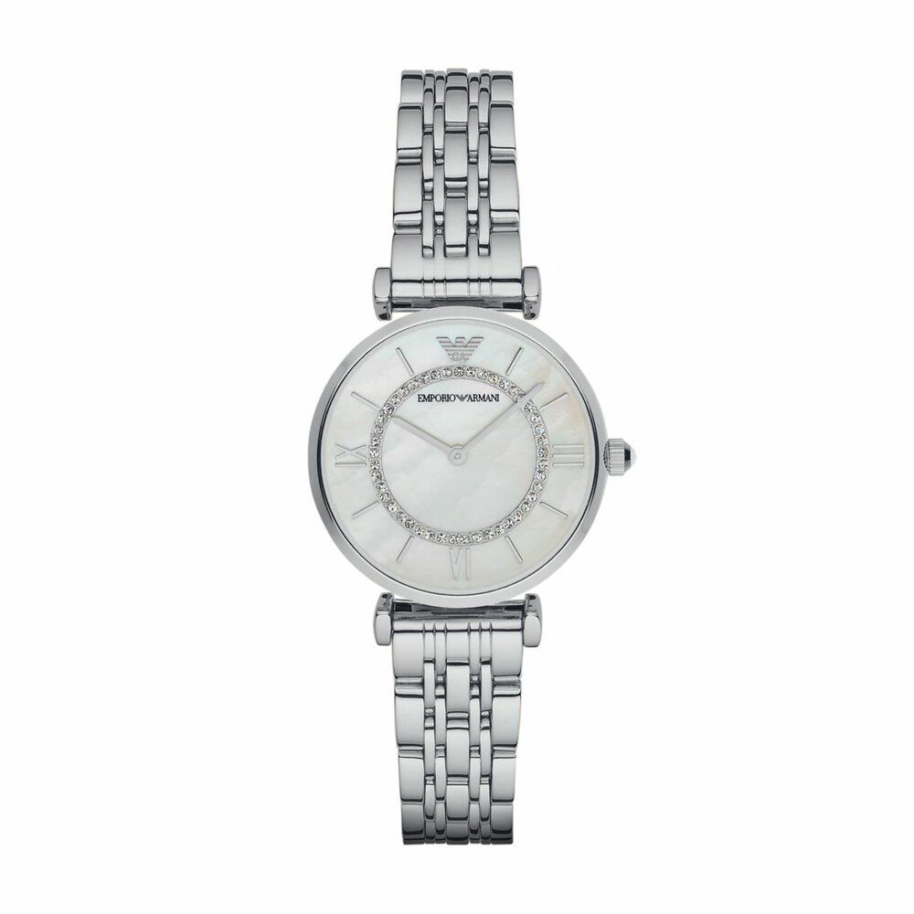 Tailored and sophisticated, this Emporio Armani timepiece showcases a Steel seven-link bracelet, matching Steel case and a feminine, mother-of-pearl dial.